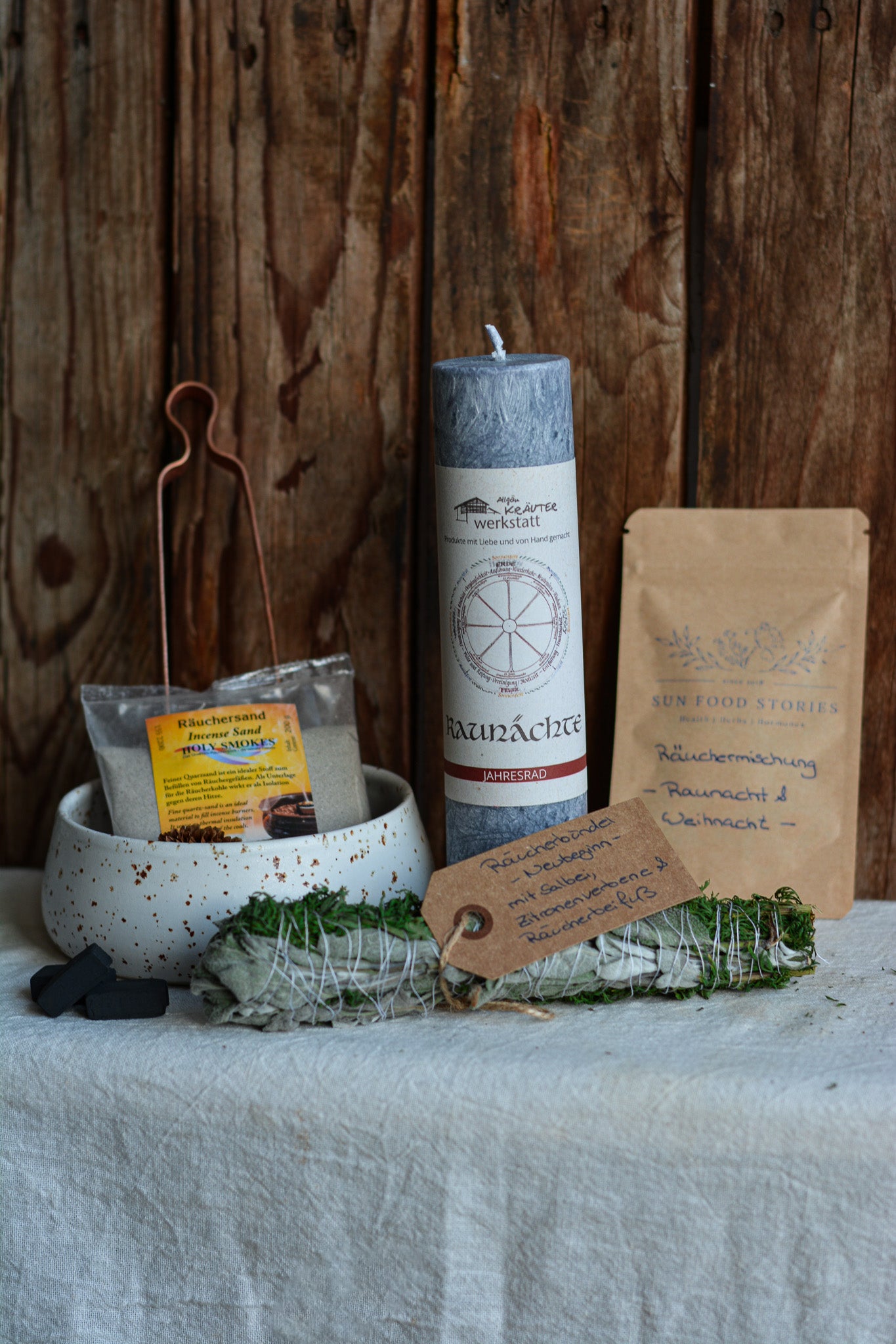 Dieses Räucherset beinhaltet alles, was du zum Räuchern mit Sand & Kohle sowie Bündel in den Raunächten und darüber hinaus benötigst.