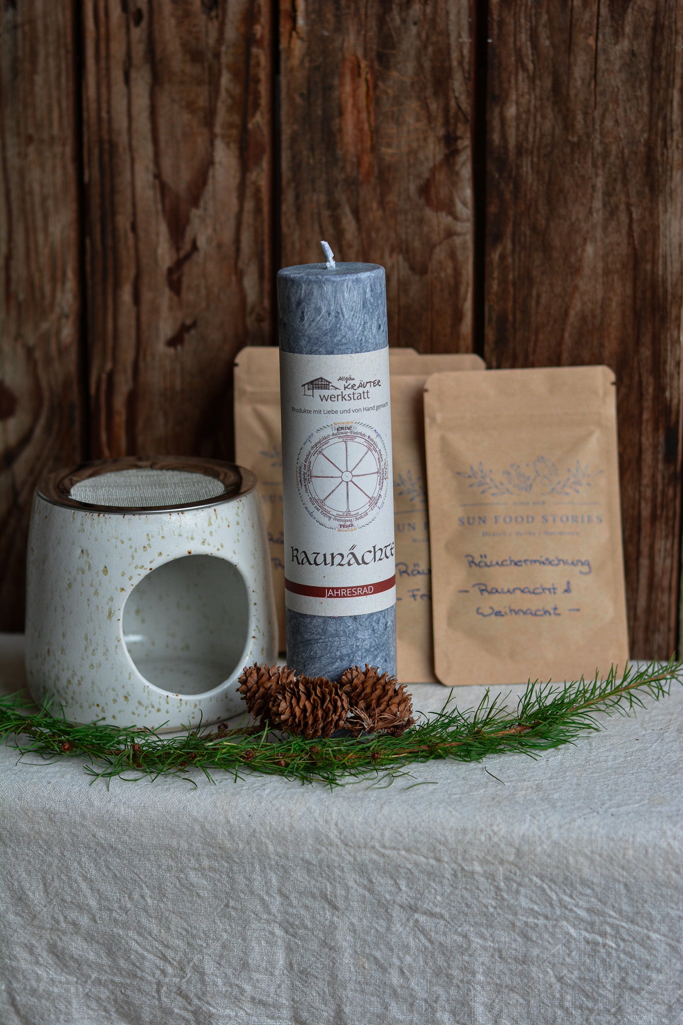 Dieses Räucherset beinhaltet alles, was du zum Räuchern mit Stövchen in den Raunächten und darüber hinaus benötigst.