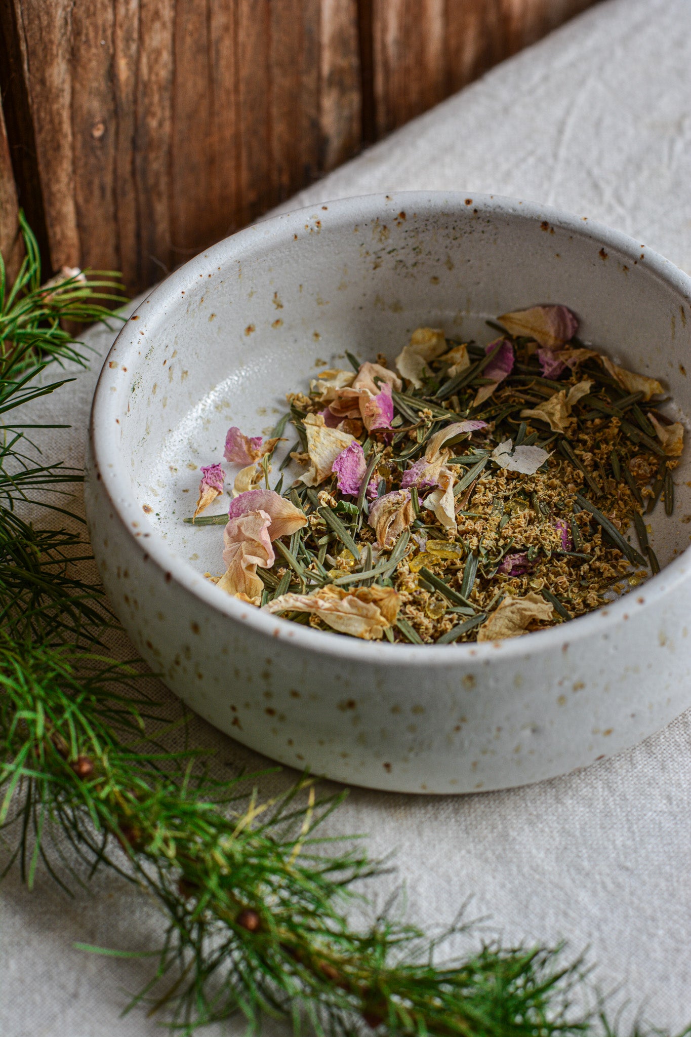 Das Harz von Kiefer & Fichte klärt und erdet. Rosenblüten öffnen das Herz.